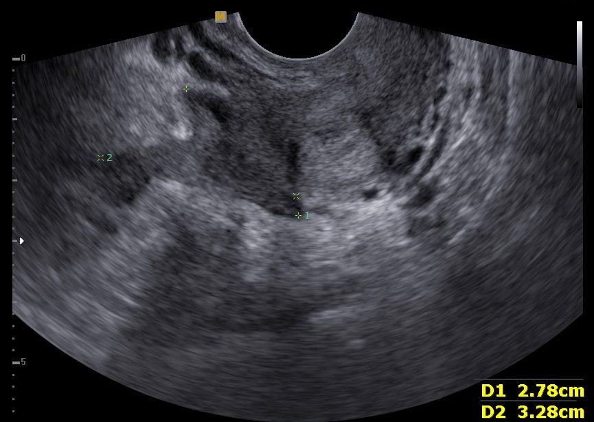 Imagem de ultrassonografia transvaginal. Útero de dimensões aumentadas e com sinais de adenomiose.