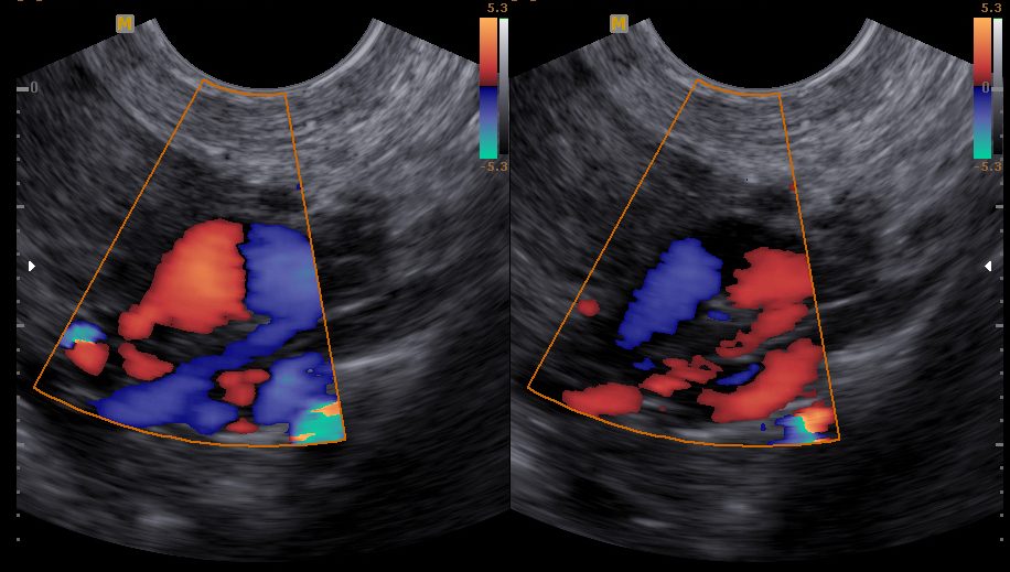 Imagem de ultrassonografia transvaginal demonstrando veias uterinas dilatadas e com mudança na direção do fluxo durante manobras provocativas, confirmando o diagnóstico de Varizes Pélvicas.
