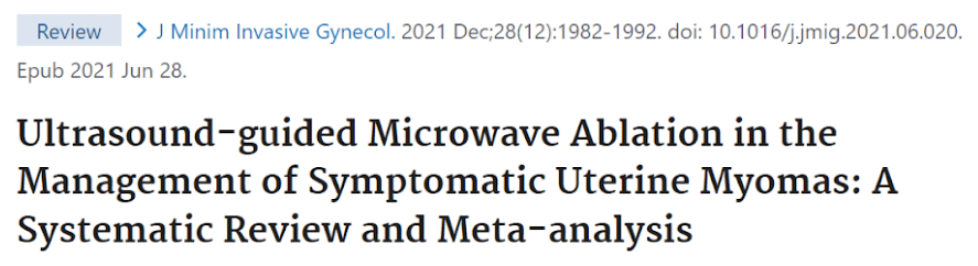Liu L, Wang T, Lei B. Ablação por microondas guiada por ultrassom no tratamento de miomas uterinos sintomáticos: uma revisão sistemática e meta-análise. J Minim Ginecol Invasivo. 2021 dezembro;28(12):1982-1992. doi: 10.1016/j.jmig.2021.06.020. Epub 2021, 28 de junho. PMID: 34197954. https://pubmed.ncbi.nlm.nih.gov/34197954/
