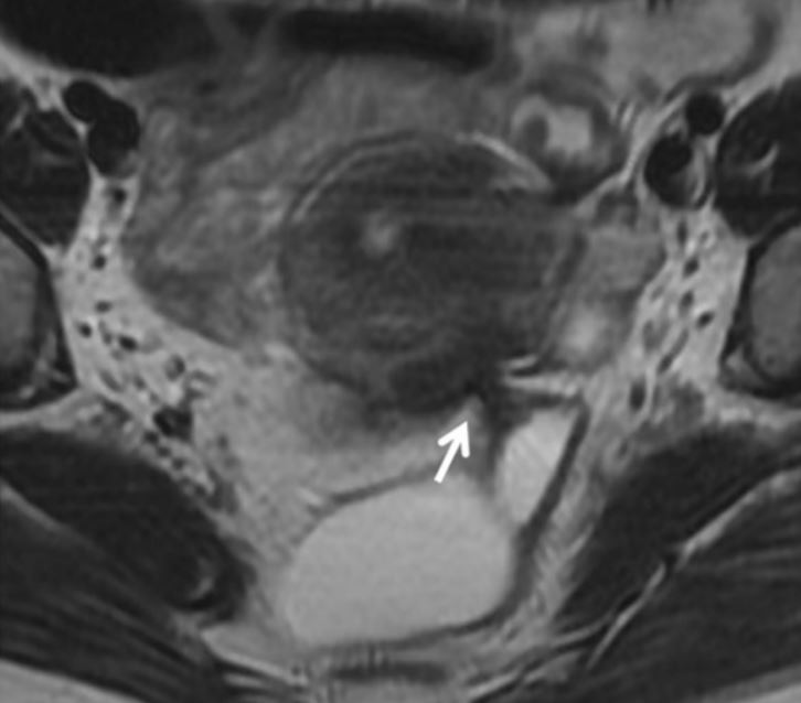 Endometriose profunda entre o útero e o reto, assinalada na seta branca. Imagem de ressonância magnética para endometriose. Mais imagens e informações podem ser obtidas neste artigo científico. https://www.ncbi.nlm.nih.gov/pubmed/29450853