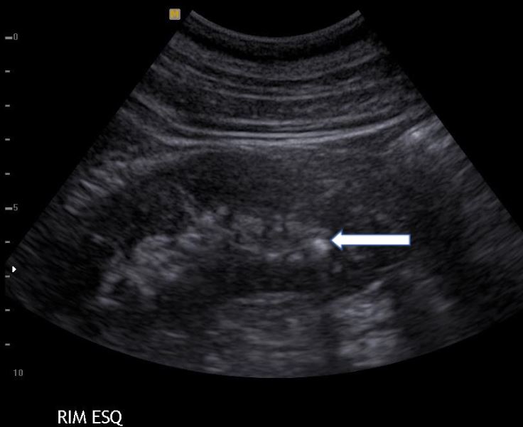Rim esquerdo com um cálculo no terço inferior, apontado pela seta branca. Exame de ultrassom do abdome total.