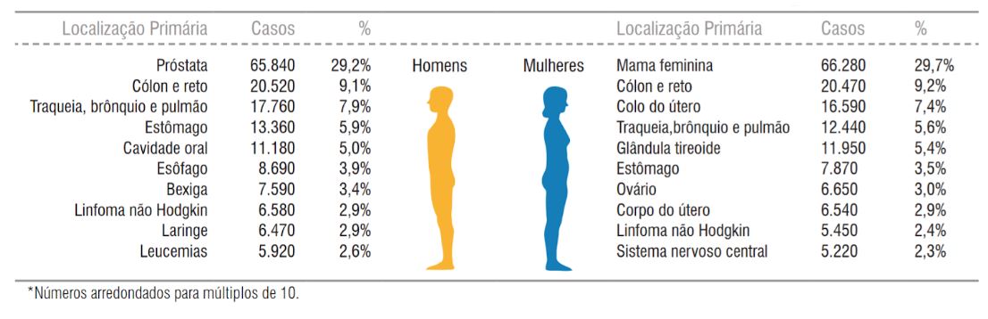 Na tabela acima encontra-se a estimativa dos 10 tumores malignos mais comuns no homem e na mulher de acordo com o INCA para 2020, exceto pele não melanoma.